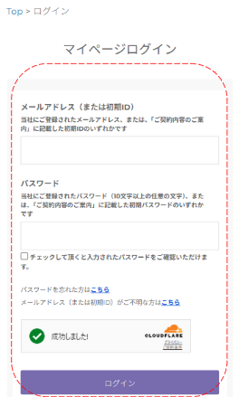 ※「チェックして頂くと入力されたパスワードをご確認いただけます。」のチェックを入れると、入力したパスワードが間違っていないか確認できます。 - マイページログイン完了