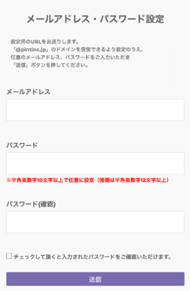 ※「チェックして頂くと入力されたパスワードをご確認いただけます。」のチェックを入れ、入力したパスワードが間違っていないか確認できます。 - マイページにアクセスし、メールアドレスと、4で登録したパスワードを利用して、ログインする。